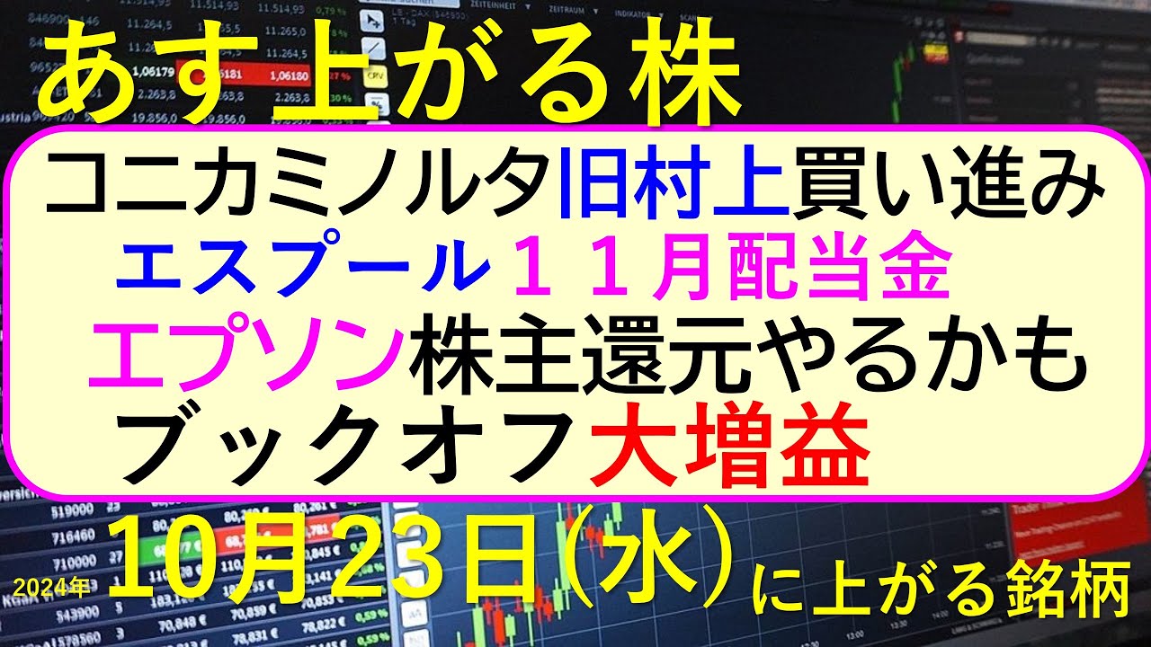 あす上がる株 2024年10月23日(水)に上がる銘柄。コニカミノルタを旧村上が買い進み。ブックオフが大増益。エプソンが株主還元をやるかもしれない~最新の日本株情報。高配当株の株価やデイトレ情報も~